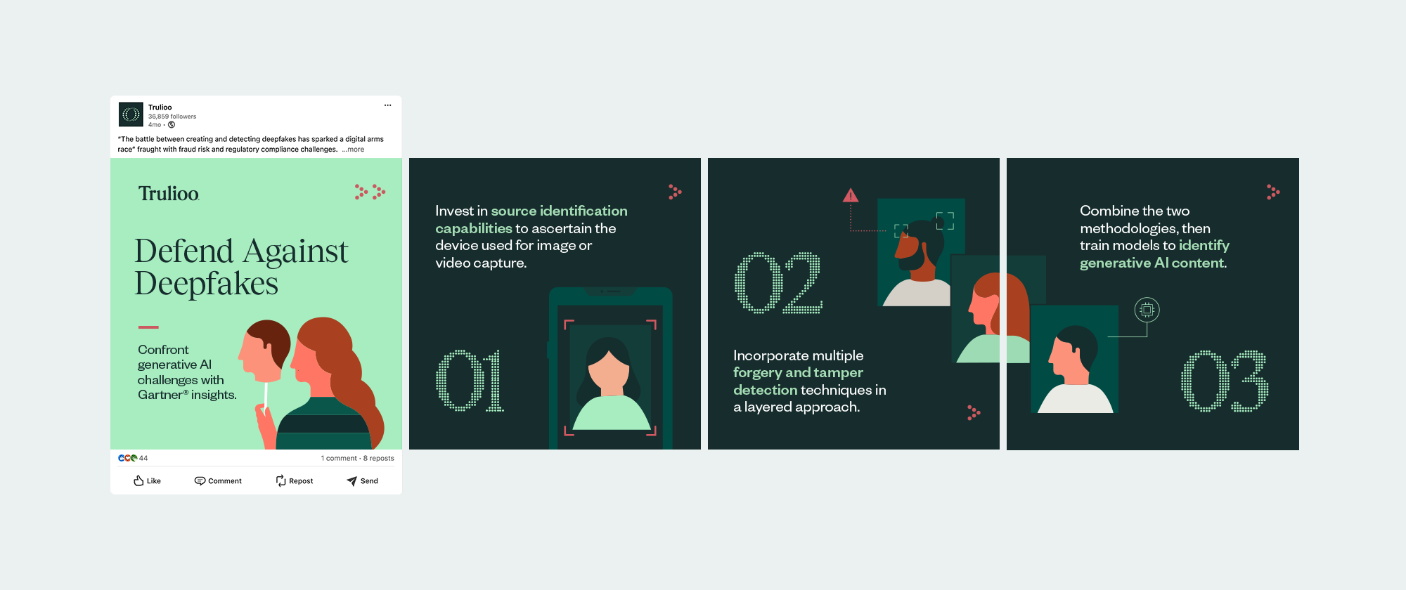 Social media is a key channel for Trulioo, requiring a steady cadence of varied and engaging content. I design a mix of static and animated assets (including carousel posts, motion graphics, and video) to support organic engagement, paid social campaigns, and employee branding – adapting visuals as needed for different formats and audiences.